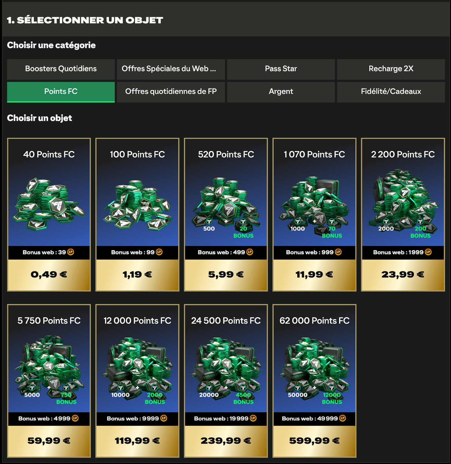 Capture d’écran de l’interface d’achat de “Points FC” utilisables dans la franchise footballistique FC éditée par Electronic Arts.