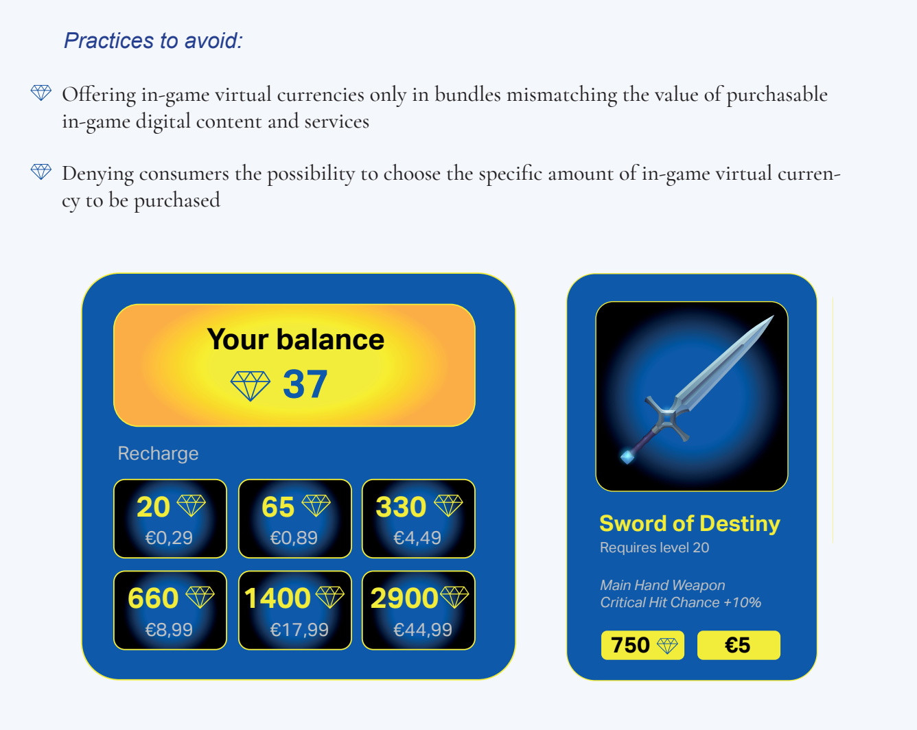 Cette pratique avait été pointée dans leFitness Check (2022) de la Commission européenne, qui illustrait que cela aboutissait à des situations où de la monnaie virtuelle restait sur le compte du joueur, sans être utilisable, du fait du prix trop élevé des autres objets disponibles. Pour le Bureau européen des unions de consommateurs (BEUC)[4], cette pratique empêche le consommateur de calculer le prix en monnaie ayant cours légal, lorsque plusieurs packs doivent être achetés et que le taux de conversion selon la taille du pack varie. Plus encore, cela entraînerait un cercle vicieux poussant le joueur à continûment racheter des monnaies virtuelles pour pouvoir dépenser ses monnaies virtuelles restantes.