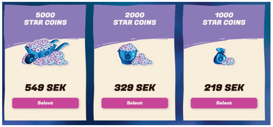 Exemple de packs de monnaies virtuelles proposés par Star Stable Entertainment, auxquels le CPC reproche l’impossibilité de les faire coïncider avec le prix d’un objet en jeu, ce qui susciterait le besoin d’en racheter à nouveau pour tenter d’équilibrer son solde.