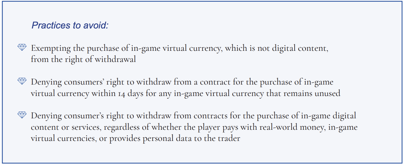 In principle, consumers have a right of withdrawal for a period of 15 days from the date of purchase of a product. This right does not apply in certain specific cases, in particular when purchasing digital content, where the consumer has consented in advance to waive their right of withdrawal. Market practice therefore consists of linking the purchase of virtual currencies to the player's waiver of their right of withdrawal.